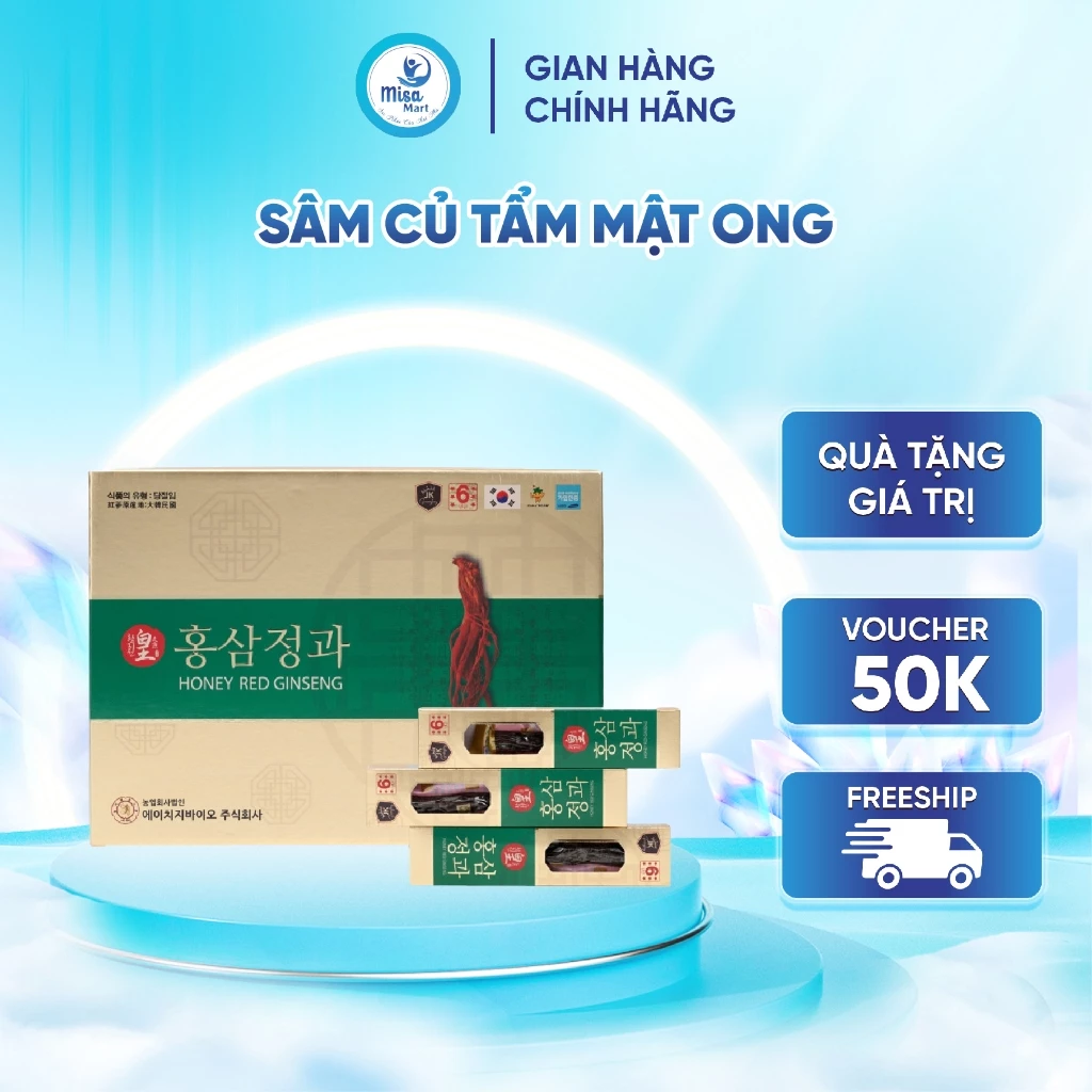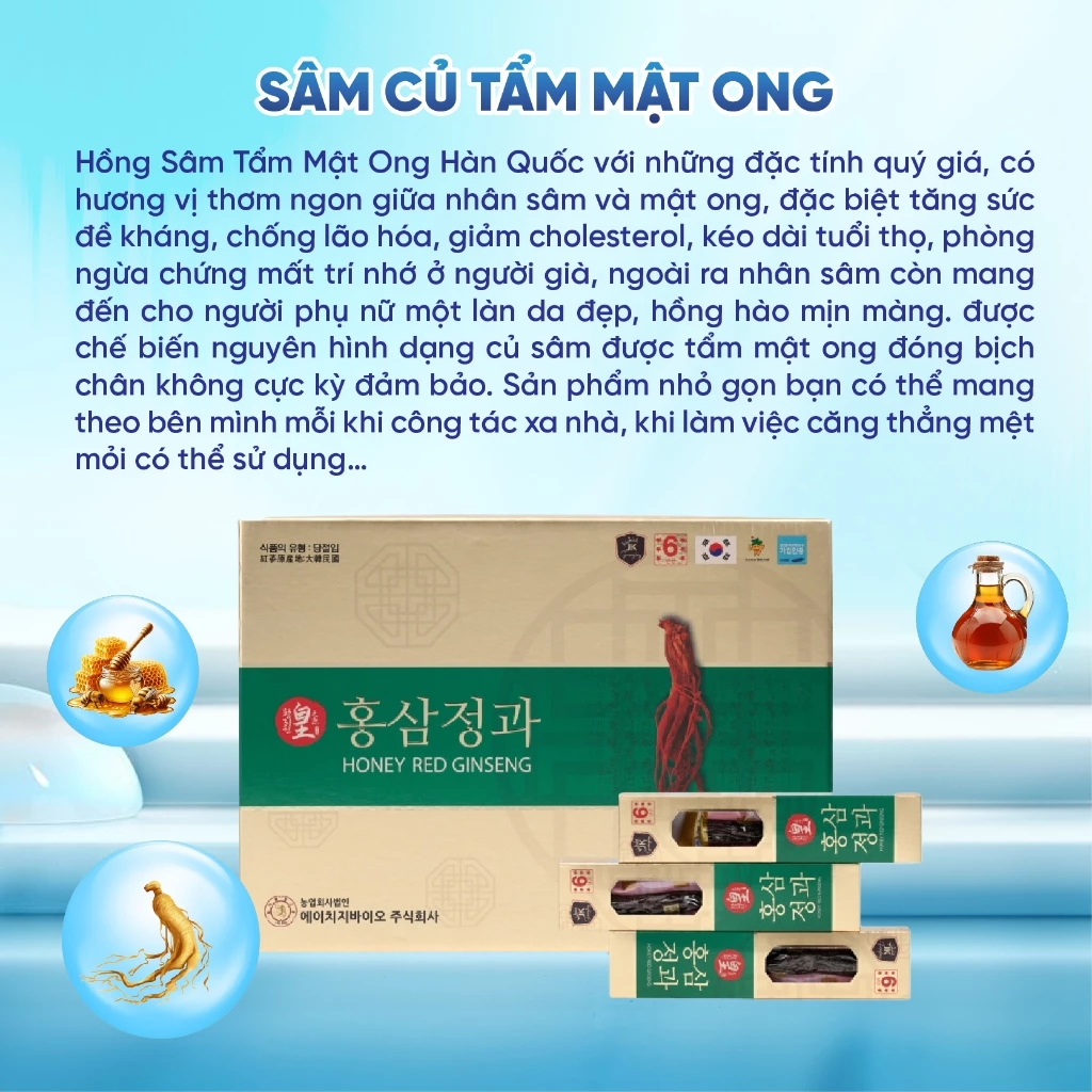 Hồng Sâm Tẩm Mật Ong Hàn Quốc với những đặc tính quý giá, có hương vị thơm ngon giữa nhân sâm và mật ong, đặc biệt tăng sức đề kháng, chống lão hóa, giảm cholesterol, kéo dài tuổi thọ, phòng ngừa chứng mất trí nhớ ở người già, ngoài ra nhân sâm còn mang đến cho người phụ nữ một làn da đẹp, hồng hào mịn màng. được chế biến nguyên hình dạng củ sâm được tẩm mật ong đóng bịch chân không cực kỳ đảm bảo. Sản phẩm nhỏ gọn bạn có thể mang theo bên mình mỗi khi công tác xa nhà, khi làm việc căng thẳng mệt mỏi có thể sử dụng…